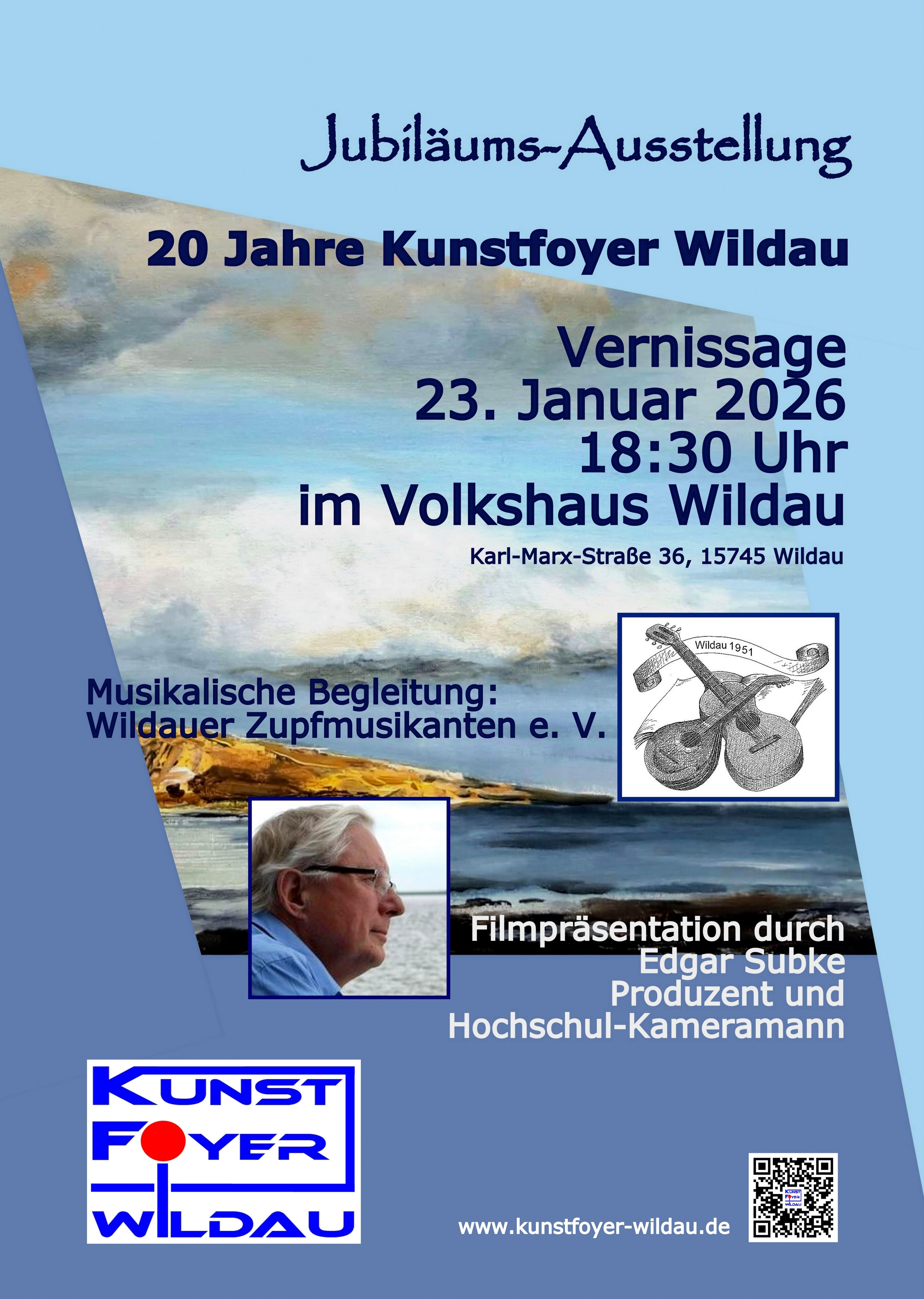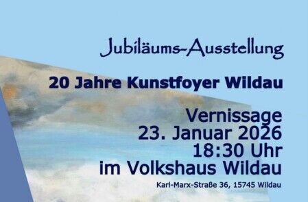 - Januar bis April Gemeinschaftsausstellung "20 Jahre Kunstfoyer" im Volkshaus Wildau - Vernissage ist am Freitag, 23.01.2026, Beginn 18:30 Uhr